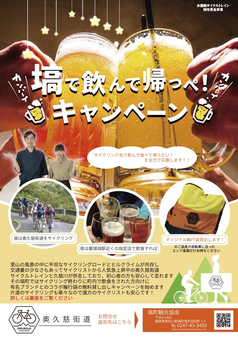 奥久慈街道サイクリングをもっと楽しく、もっと気軽に。塙町では水郡線サイクルトレイン支援事業の一環として、「塙で飲んで帰っぺキャンペーン」を実施中です!